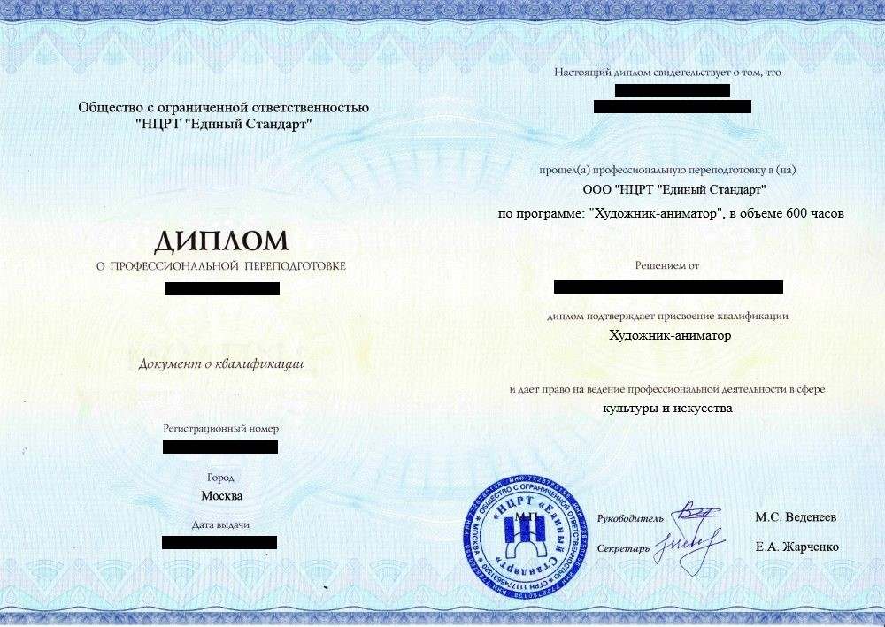 • «Художник-аниматор» с правом осуществления профессиональной деятельности в сфере культуры и искусства